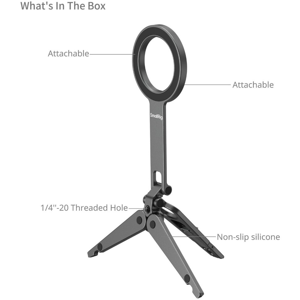 Магнитная система крепления и продуманная эргономикаДержатель оснащен двусторонним MagSafe, что позволяет легко переключаться между съемкой на основную и фронтальную камеры. Для смартфонов без магнитной поддержки в комплекте предусмотрено металлическое кольцо. В основании треноги предусмотрено винтовое отверстие 1/4" для совместимости с различными аксессуарами или штативом |