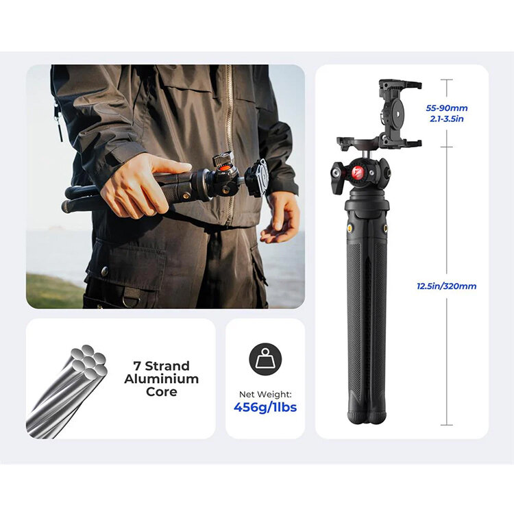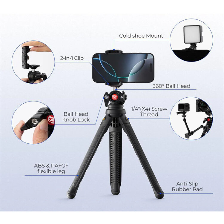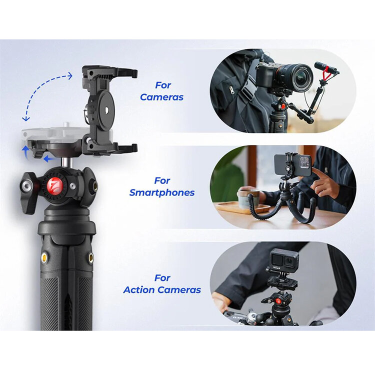 Универсальность для креативных задач2-в-1 шаровая голова мгновенно переключается между площадкой для камеры и держателем смартфона, идеально подходя для видеоблогинга и live-стримов. Два холодных башмака и четыре резьбовых порта 1/4" позволяют крепить микрофон, свет или дополнительные аксессуары. Компактные размеры и регулируемая высота (37–41 см) делают Vlogpod 3K незаменимым для съемки в ограниченном пространстве, а складывающаяся конструкция помещается даже в небольшую сумку |
