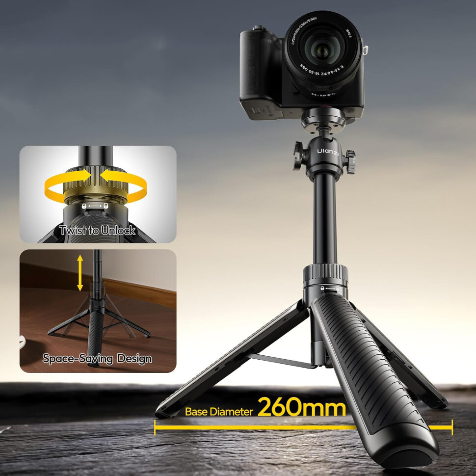 Универсальный спутник для динамичных съемокПортативный штатив Ulanzi MT90 Cka представляет собой 2-в-1 систему, сочетающую функции трипода и селфи-палки. Благодаря пятисекционной телескопической конструкции с быстрыми замками, устройство регулируется от компактных 21.5 см до максимальных 62 см, обеспечивая гибкость для селфи, групповых фото и видеоблогинга. Система быстрого крепления Cka с U-образным пазом обеспечивает мгновенную установку оборудования совместимого со стандартами 1/4" и GoPro. Алюминиевый шаровой шарнир с плавным вращением на 360 градусов позволяет точно позиционировать камеру в любой плоскости |