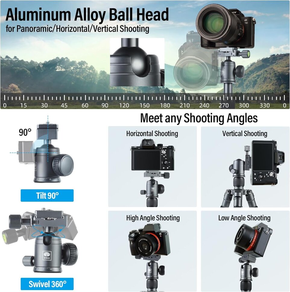 Панорамная головка 360°Комплект включает в себя шаровую голову с возможностью панорамирования на 360°. Это обеспечивает удобство вертикальной и горизонтальной съемки с любого угла. В основании ног предусмотрено винтовое крепление 1/4", а на конце центральной колонны 3/8", что позволяет добавить к штативу полезные приспособления |