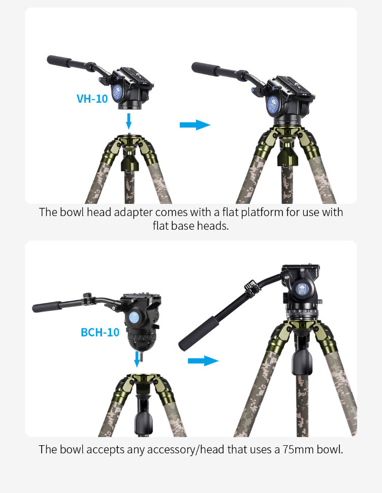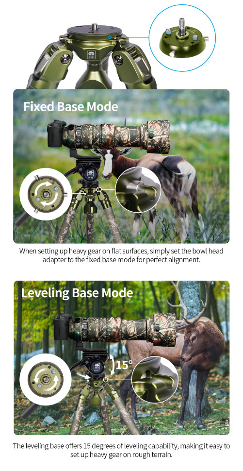 Штатив серии Explorer имеет специальный адаптер с двумя режимами работы. В стандартном он выполняет роль плоского основания, но если убрать боковые штифты, то адаптер станет выравнивающей площадкой, с углом наклона 15°. Если снять адаптер, то в основании штатива будет чаша 75мм |