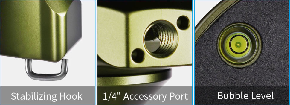 Оснащен пузырьковым уровнем, дополнительный резьбовым отверстием 1/4" для аксессуаров и крюком для использования груза. В комплекте предусмотрены металлические шипы для работы на грунте |