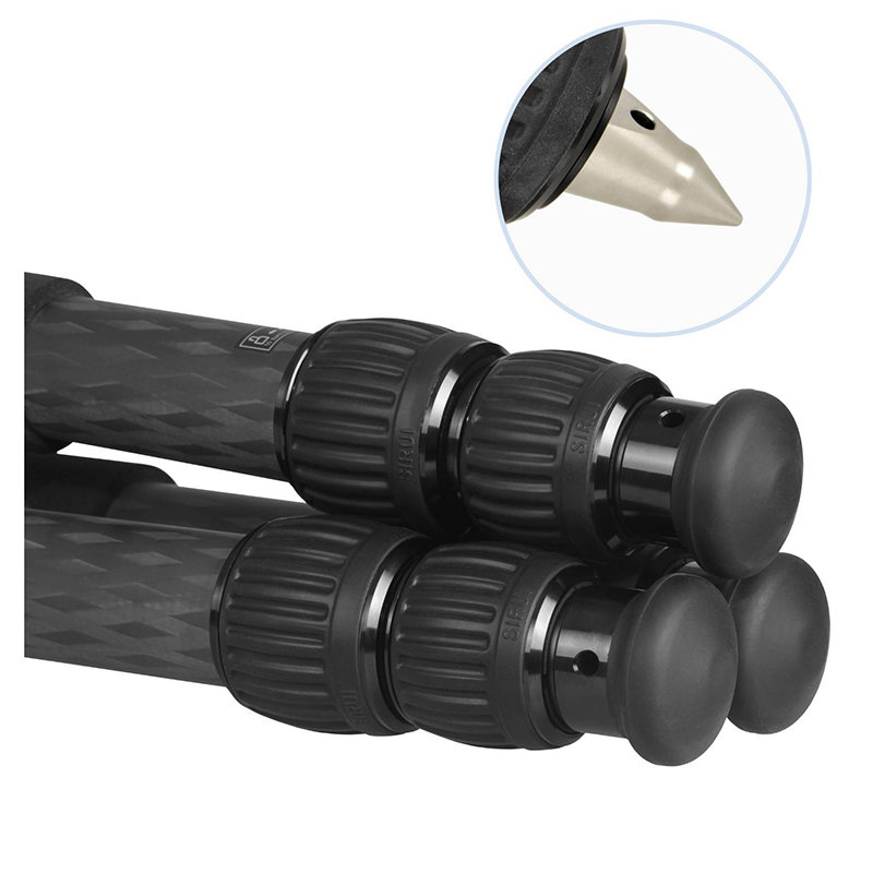 | Для обеспечения грузоподъёмности штатив имеет сильные замки фиксирующие положение и длину ног, а также противоскользящие колпачки, сняв которые вы обнаружите шипы для работы на грунте. Центральная колонна может быть установлена наоборот, что позволяет снимать с низкого ракурса и будет удобно для макросъёмки с массивной камерой |