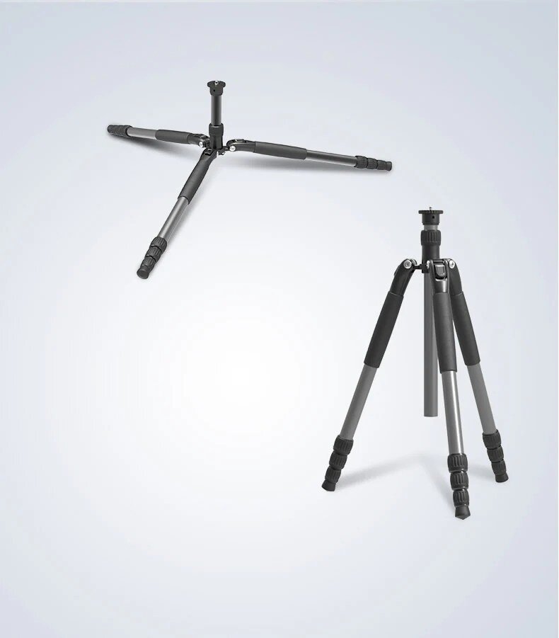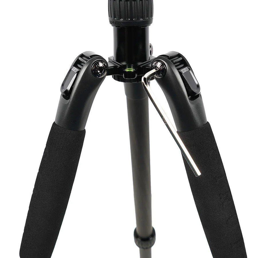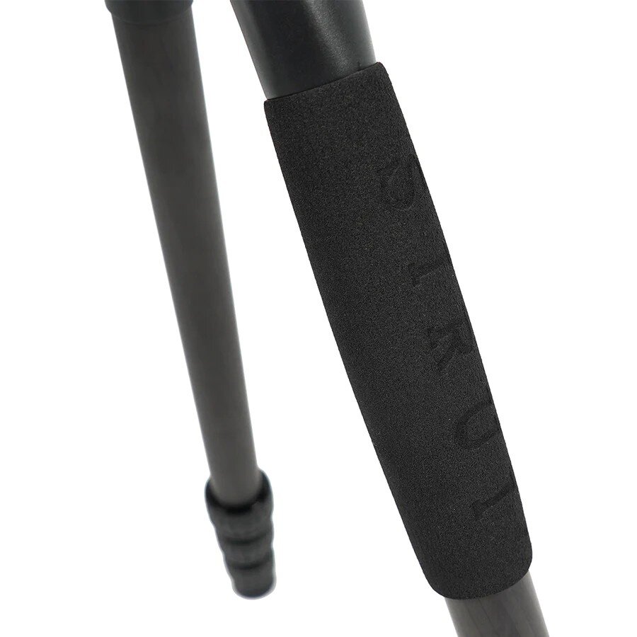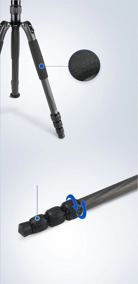 Четырёхсекционные ноги имеют надежные поворотные замки и выполнены из карбона, что обеспечивает малые вес конструкции - всего 1 кг. Для дополнительной устойчивости в нижней части центральной колонны предусмотрен крюк, на который можно повесить дополнительный груз. Противоскользящие наконечники ног предотвратят скольжение, а специальные мягкие накладки сделают работу при низкой температуре более комфортной |