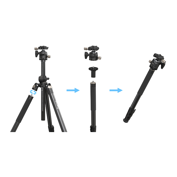 Штатив или монопод?Благодаря четырёхсекционным ногам с рычажными замками, вы сможете легко и быстро регулировать высоту штатива до 185 см, а также перевернуть съёмную центральную колонну для съёмки под низкими углами. Если потребуется, вы сможете легко и быстро превратить штатив в монопод, разобрав одну из его ног и прикрепив её к голове |