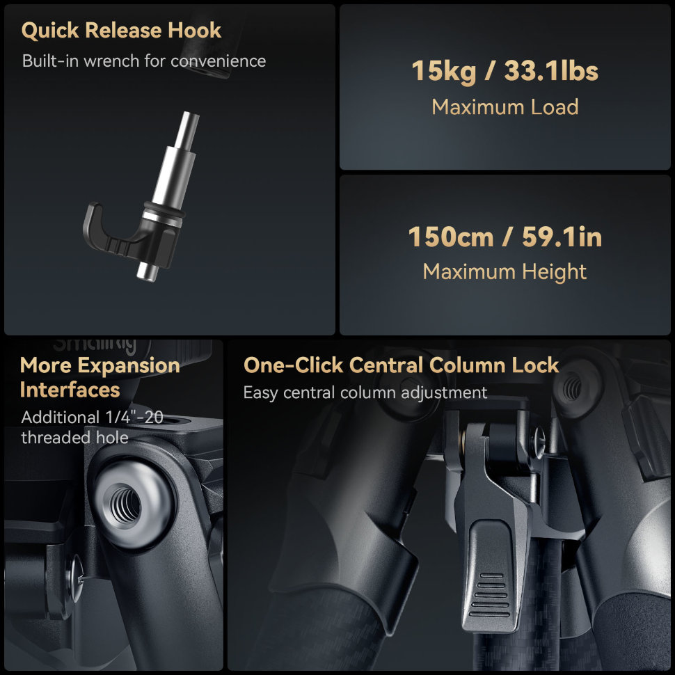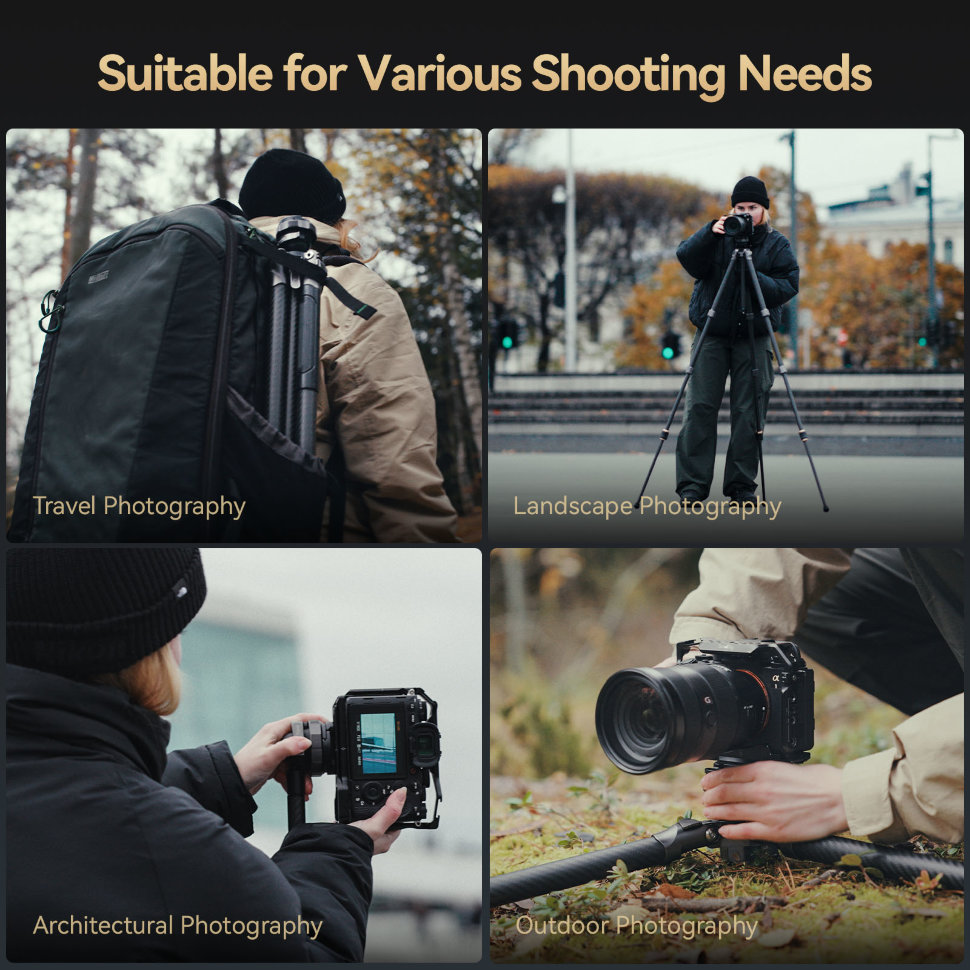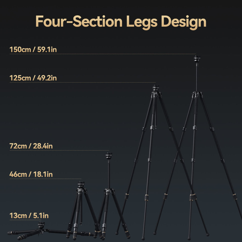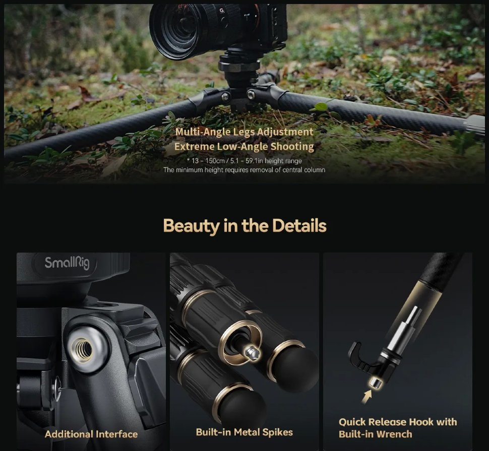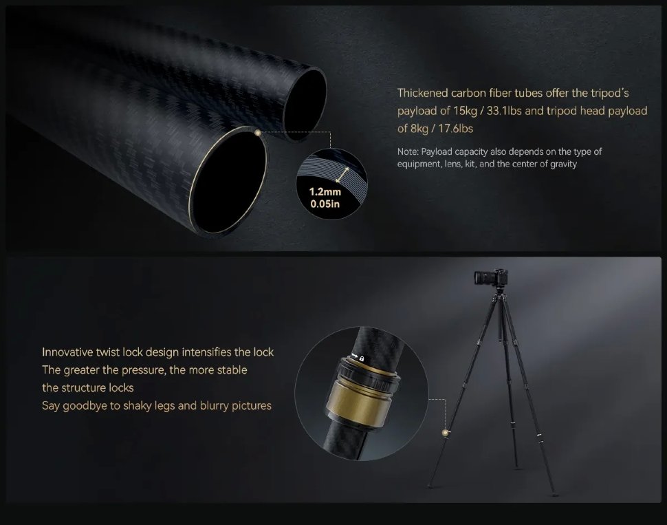 Ноги выполнены из карбона с толщиной стенки в 1.2мм, что гарантирует высокую прочность при совсем низком весе. Под резиновыми наконечниками скрыты металлические шипы, что делают AP-100 идеальным вариантом для съёмки на природе |