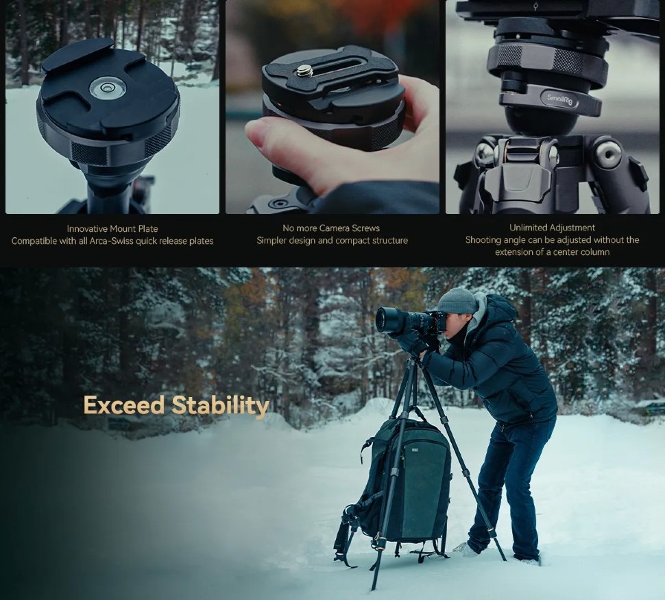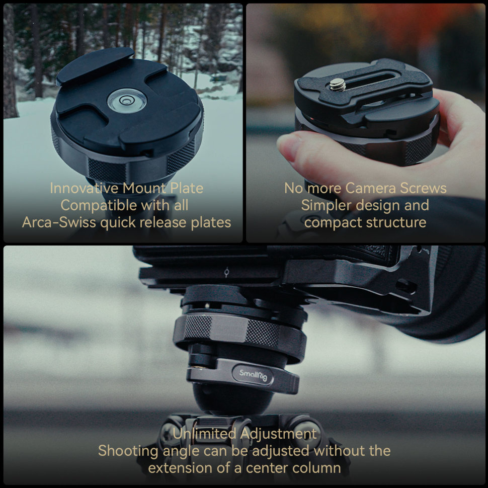 Шаровая голова может быть установлена как на центральную колонну, так и на саму базу, для съёмки с самого низкого ракурса. Максимальная полезная нагрузка головы 8 кг, а самого трипода 15кг!. Специальная быстросъёмная площадка стандарта Arca Swiss оснащена удобной системой быстрой фиксации с большим рыцагом |