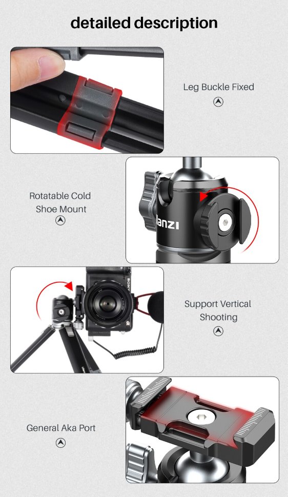 Изготовлена стойка из авиационного алюминия, способна выдерживать повышенную нагрузку. В верхней части имеется шаровая голова, обеспечивающая вращение камеры на 360 градусов |