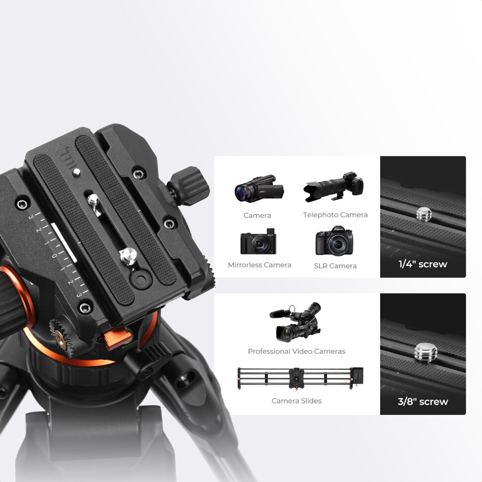 10 кг нагрузкиЖидкостная видеоголова с плоским основанием 75мм подойдет как для классических треног с центральной колонной, так и для heavy моделей для установки на полусферу. Её максимальная нагрузка в 10 кг позволяет работать не только с беззеркальными камерами, но и тяжелыми производственными моделями и даже слайдерами |