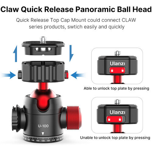 Функциональная шаровая голова с боковым креплением для холодного башмака. Благодаря креплению можно дополнительно установить осветитель, микрофон и любое другое оборудование. Имеется быстросъемная пластина Ulanzi CLAW для быстрой установки камеры |