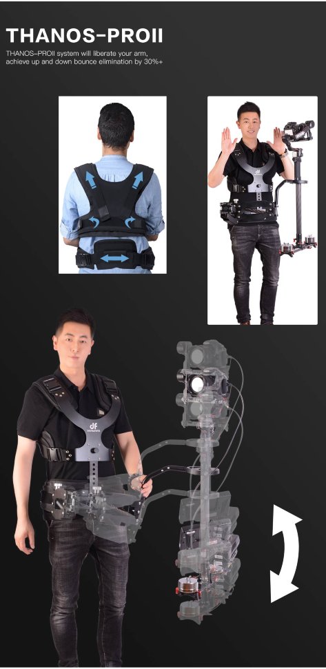 Конструкция крепится к специальному жилету, благодаря которому нагрузка распределяется равномерно, что обеспечивает более комфортную работу. С данной системой освобождаются руки, благодаря чему открывается возможность использвоать дополнительное оборудование для съёмки |