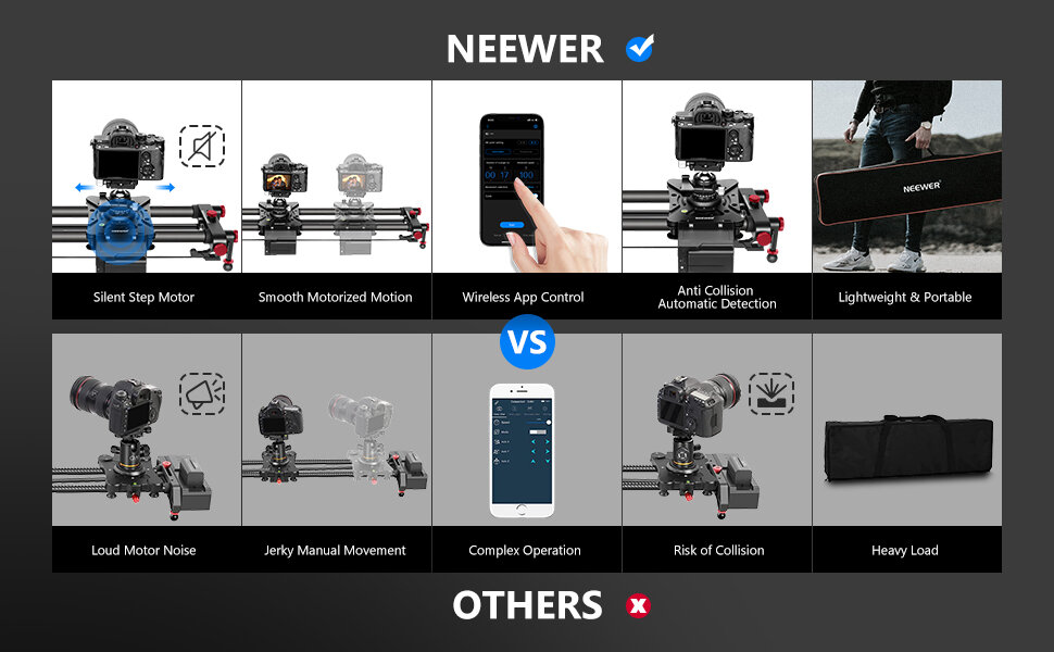 Интеллектуальное управлениеСлайдер оснащен интеллектуальной системой управления, поддерживающей приложение NEEWER и пульт дистанционного управления. Благодаря этому решению вы получаете полное управление движением камеры, включая ручной режим, режим постоянной скорости и функцию замедленной съемки. Настройка таких параметров, как интервал, кадры, выдержка и экспозиция, позволяет создавать плавные и точные кадры, что особенно важно для панорамных и трекинговых съемок |