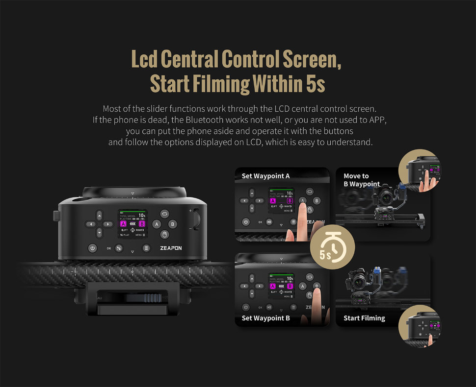 Удобное управлениеДля удобства настройки параметров движения, слайдер оснащен дисплеем, который позволяет быстро и легко изменять точки A и B заменяя работу с приложением. Это дает вам полный контроль над процессом съемки и позволяет достичь желаемого результата. Особенностью слайдера является блокировка положения и площадки панорамирования. Это позволяет создавать стабильные и плавные движения, а также делать панорамные съемки без искажений |