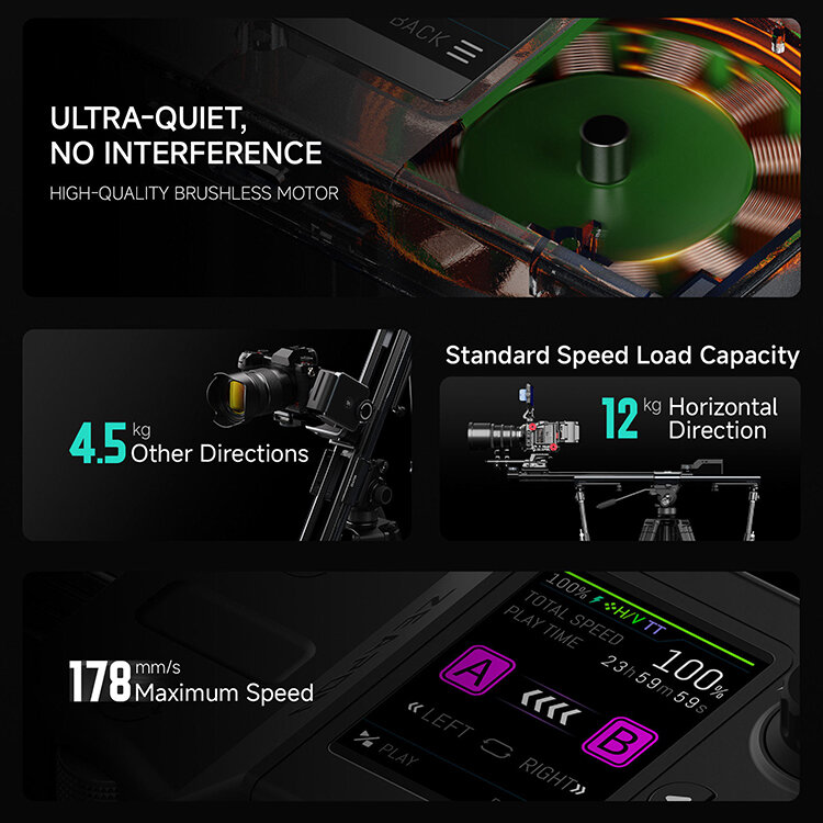 Интеллектуальная система управления и плавная регулировка скоростиМгновенный регулятор скорости обеспечивает бесступенчатое управление, а значит можно плавно изменять движение слайдера без задержек. С максимальной скоростью – 178 мм/с, и минимальной – 0.18 мм/с, Micro4 становится универсальным инструментом для различных типов съемок. Сенсорный экран делает управление настройками лёгким, включая настройку точек A/B, съемку таймлапсов и автоматическое движение влево/вправо |