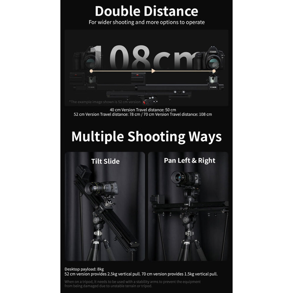 Качественная съёмкаКаретка слайдера имеет жидкостное демпфирование, что гарантирует максимальную плавность хода в мануальном режиме. Горизонтальная нагрузка составляет 8 кг, а значит выдержит практически любую камеру |
