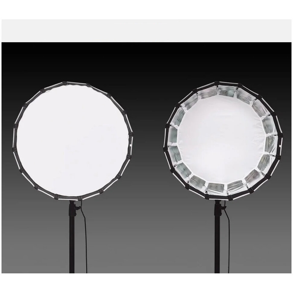 Профессиональный параболический софтбокс, созданный для точного и качественного освещения в видеопроизводстве, стриминге и студийной фотографии. Прочная конструкция из 16 стальных спиц обеспечивает стабильную круглую форму и быструю сборку, а совместимость с креплением Bowens Mount делает его универсальным для большинства студийных моноблоков. Дополнительные соты с углом рассеивания 45 градусов позволяет точно контролировать направление и границы светового потока, создавая акцентное или контровое освещение без нежелательных засветок