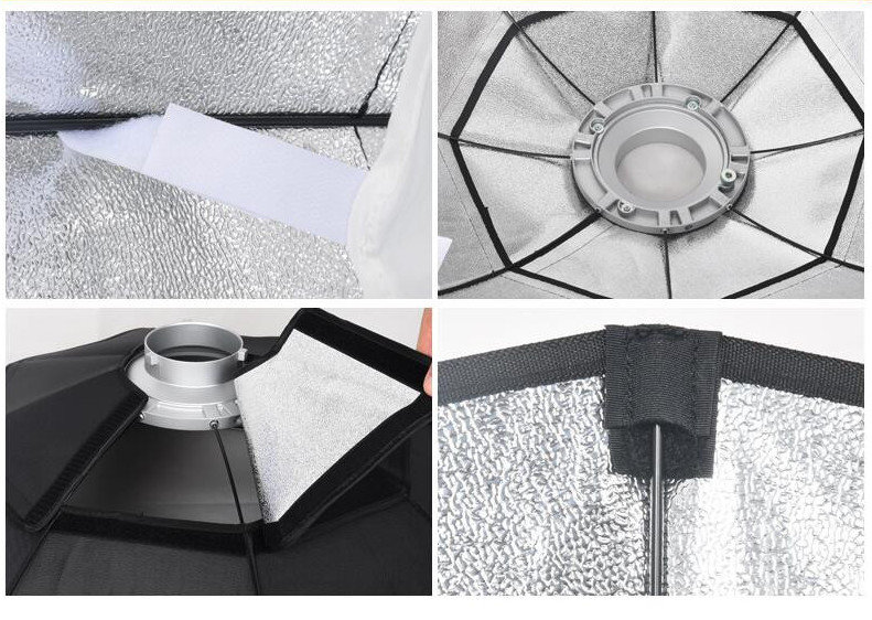 Профессиональный софтбокс имеет форму восьмигранника и устанавливается на световой оборудование с байонетом Bowens. Округлая форма отлично подойдет для предметной и портретной съёмки, благодаря более натуральному круглому блику |