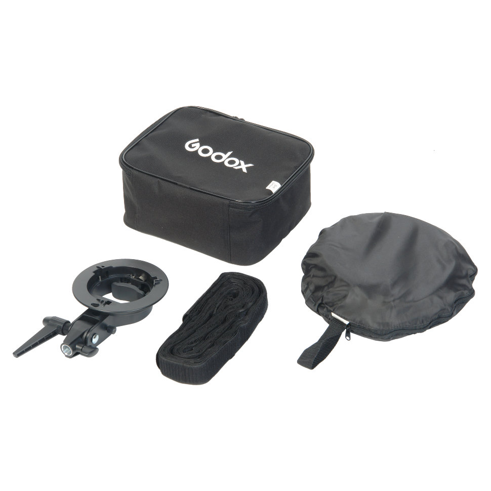Аксессуар представляет собой два рассеивателя, благодаря которым можно получить более равномерный и мягкий световой поток. Для установки сотовой решетки предусмотрена липучка по краю конструкции. Софтбокс раскладывается по принципу лайт-диска, ткань натягивается на металлические спицы |