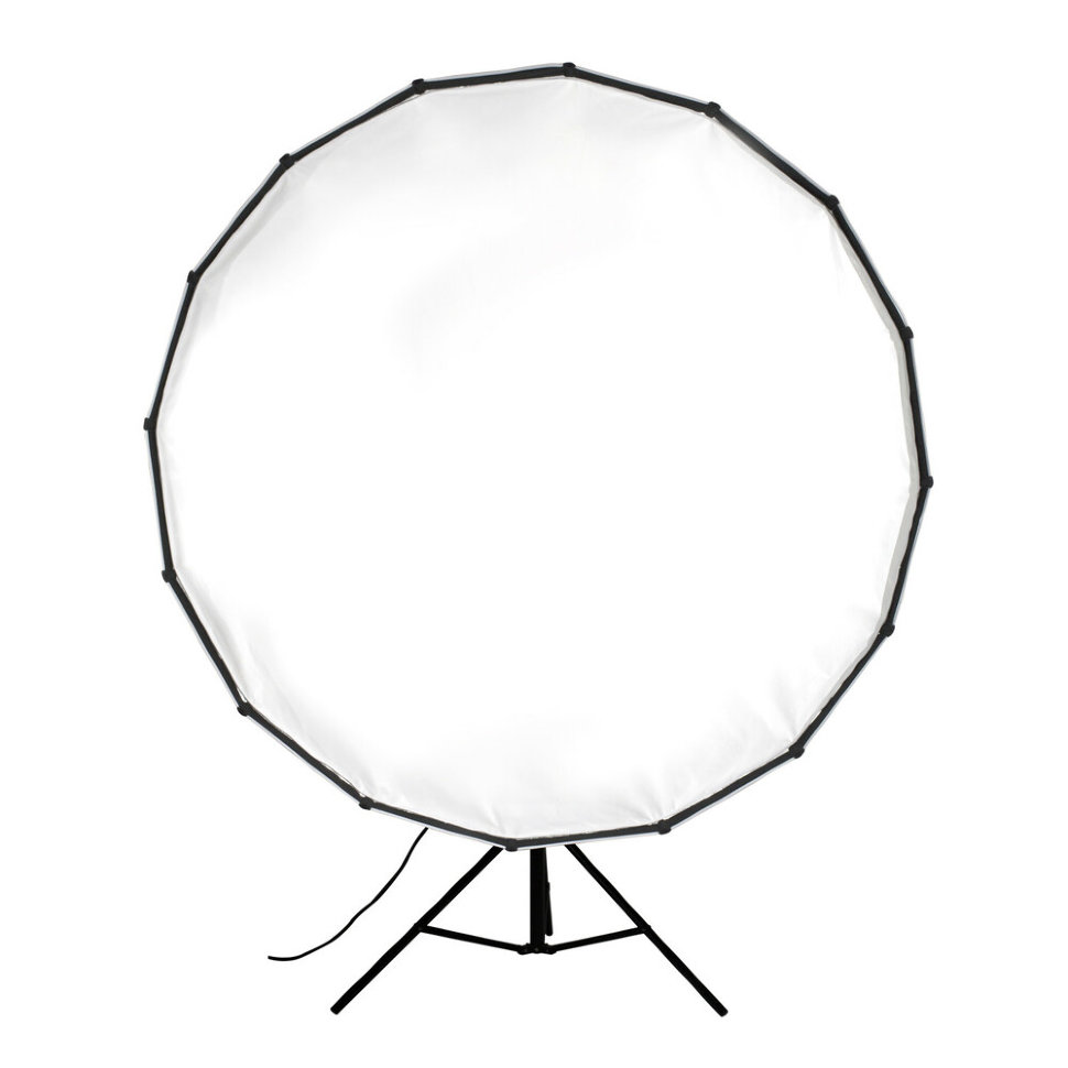 Софтбокс диаметром 150см с двумя рассеивателями в комплекте. Светоформирующая насадка поможет сделать световой поток более мягким и равномерным, благодаря увеличению площади источника света |