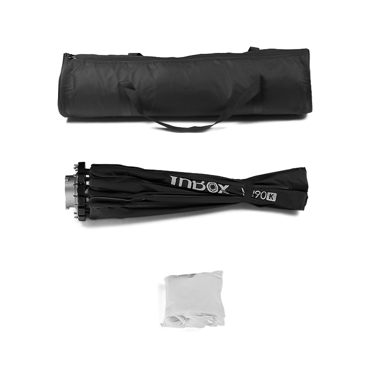 Параболический софтбокс с креплением Bowens для любого совместимого моноблока. Конструкция достаточно легко складывается и раскладывается, и также легко устанавливается |