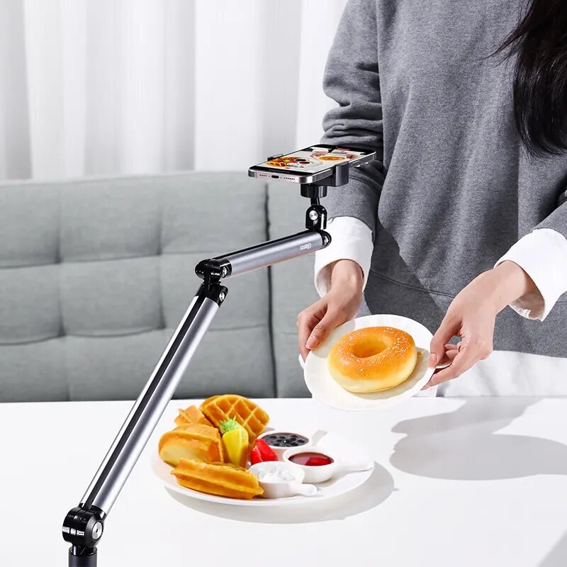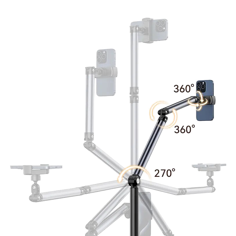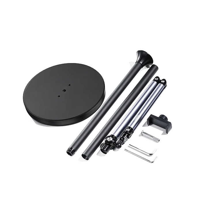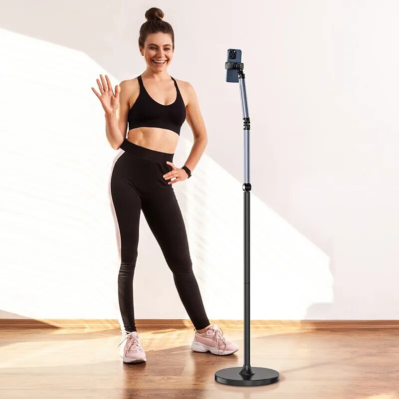 Удобство использованияВысоту стойки можно регулировать от 800 мм до 1450 мм. Теперь вы сможете снимать и просматривать контент не только стоя, но и сидя или даже лежа. Прочное круглое основание гарантирует стабильность и надежность во время съемки, а прочные материалы изготовления делают устройство еще и износостойким |