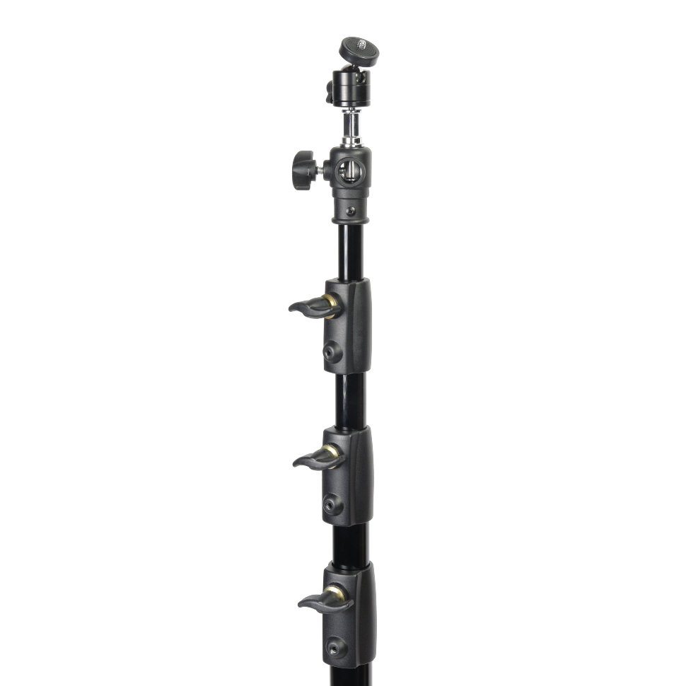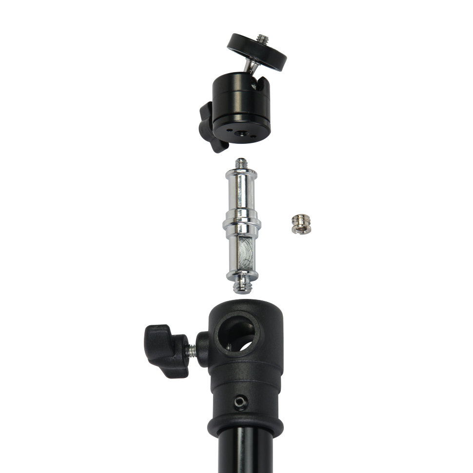 Тренога снабжена небольшой металлической шаровой головкой с винтом 1/4" на конце для установки съемочного оборудования. Установленная камера способна вращаться вокруг своей оси на 360° и наклоняться вперед на 90° |