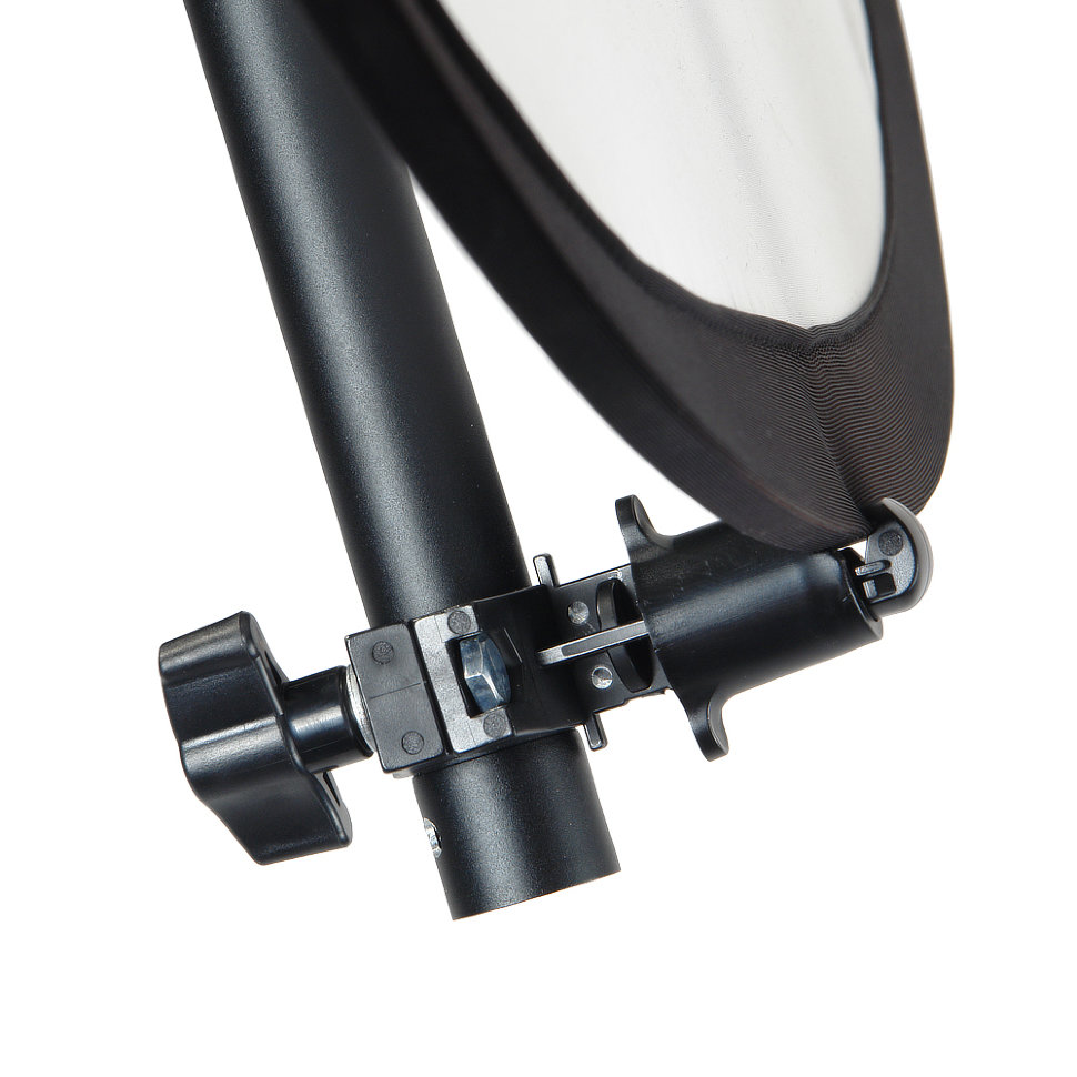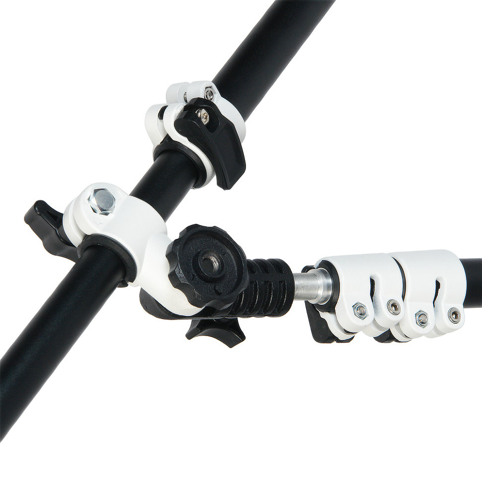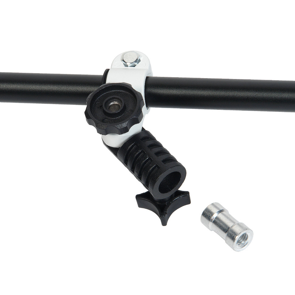 Установка перекладины производится с помощью кронштейна с винтовым зажимом. Трещоточный механизм позволяет регулировать угол наклона перекладины и защищает от произвольного смещения при работе. Перекладина имеет два держателя для фона или отражателя и отверстие для противовеса |
