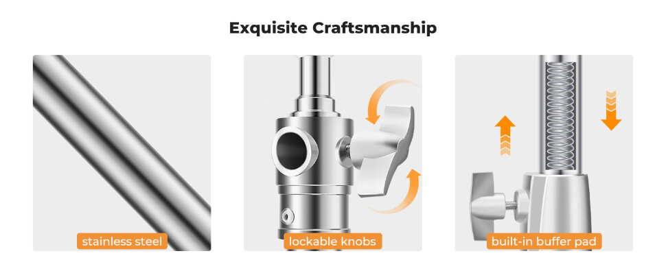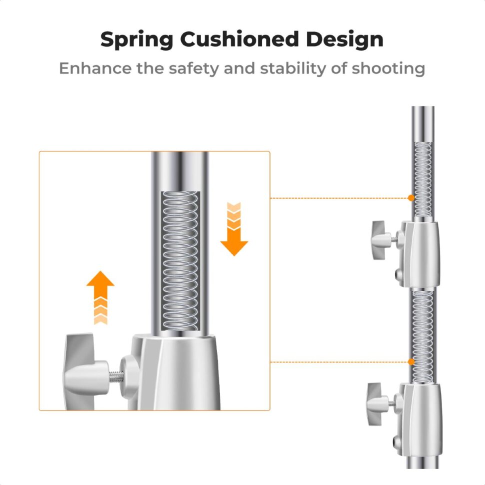 Штатив дополнен встроенными пружинными амортизаторами, которые эффективно защищают оборудование от резких ударов и вибраций. Это идеальный выбор для установки светодиодных панелей, кольцевых ламп, студийных осветителей, вспышек, софтбоксов и рефлекторов. Благодаря максимальной грузоподъемности до 10 кг, этот штатив подойдет для самых разнообразных задач в фото- и видеосъемке