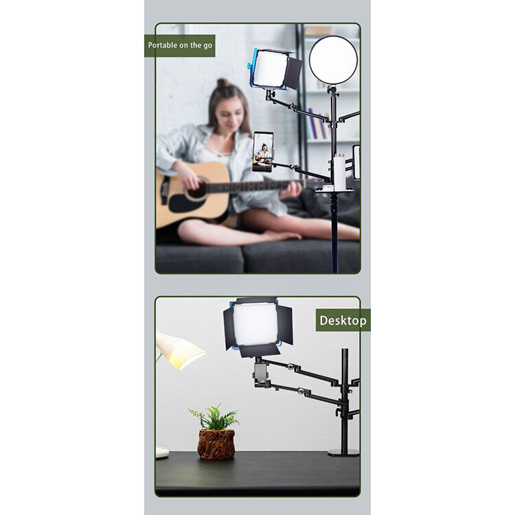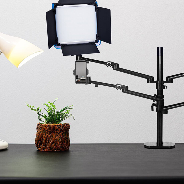 Многофункциональная стойка для стола поможет эргономично устроить рабочее пространство. Несколько специализированных кронштейнов помогут развесить осветители, ноутбук, микрофон и другие гаджеты для самой комфортной съёмки |