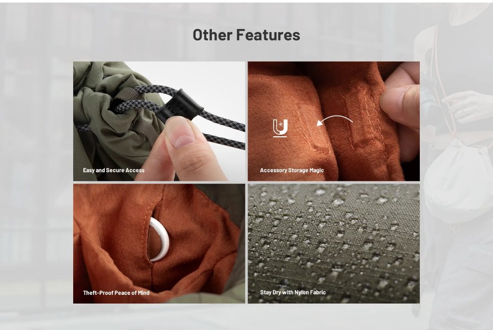 Съемка налегкеСумка-мешок Drawstring серии OneGo – идеальный выбор для активных людей, любящих запечатлевать моменты жизни с помощью камеры. Изготовленная из легкой и надежной нейлоновой ткани, она сочетает в себе элегантность и универсальность |