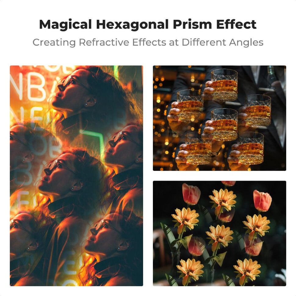 Волшебный калейдоскопСветофильтр-призма создает уникальный визуальный эффект с шестью повторяющимися изображениями, благодаря гексагональной призменной структуре, вдохновленной ретро-кинематографом. Изготовленный из высококачественного оптического стекла K9, он обеспечивает свыше 99% светопропускания, сохраняя четкость и реалистичность цветопередачи даже при сложных световых условиях. Поворотная рамка толщиной 7,5 мм с оксидированным и пескоструйным покрытием исключает попадание паразитных засветок, а плавный механизм вращения на силиконовом демпфирующем масле позволяет точно позиционировать эффект  |