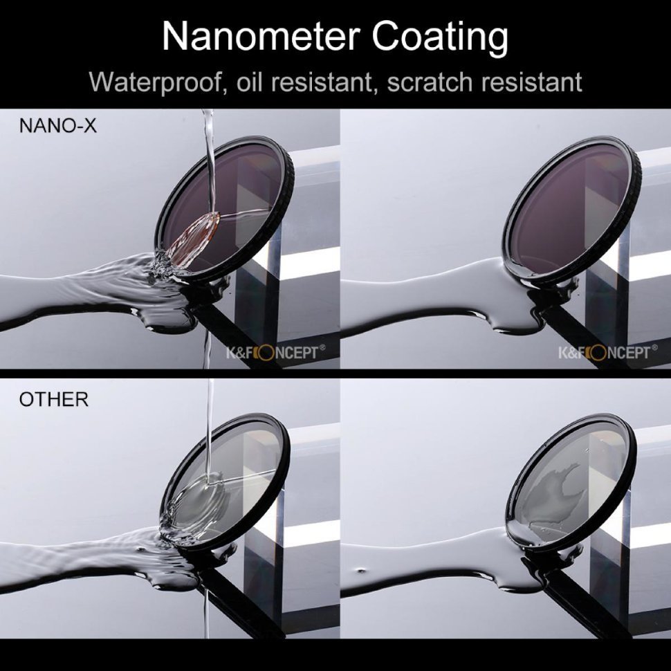В отличие от аналогов, в этой серии фильтров K&F Concept используется не нанесение состава на стекло, а уже готовая линза с необходимым эффектом, что повышает качество работы. Также, модель избавлена от X-эффекта, регулировка плотности всегда проходит плавно и равномерно. Поверхность фильтра устойчива к царапинам и имеет олеофобное покрытие, что гарантирует долговечность и чистоту кадра  |