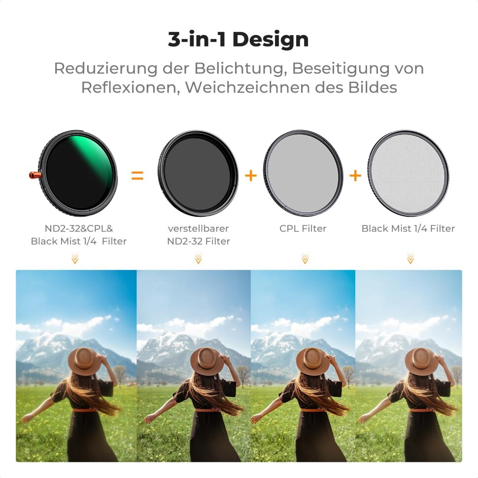 Три эффекта в одном фильтреСветофильтр объединяет функции поляризатора (CPL), переменного ND (2-32) и Black Diffusion (1/4) для комплексного контроля над светом и атмосферой. Поляризатор устраняет блики с воды и стекла, ND снижает экспозицию на 1–5 ступеней, а диффузия смягчает блики, добавляя кадрам кинематографичности. Уникальная ручка с блокировкой позволяет регулировать CPL и ND по отдельности, избегая эффекта «X» на фокусных расстояниях от 35 мм  |