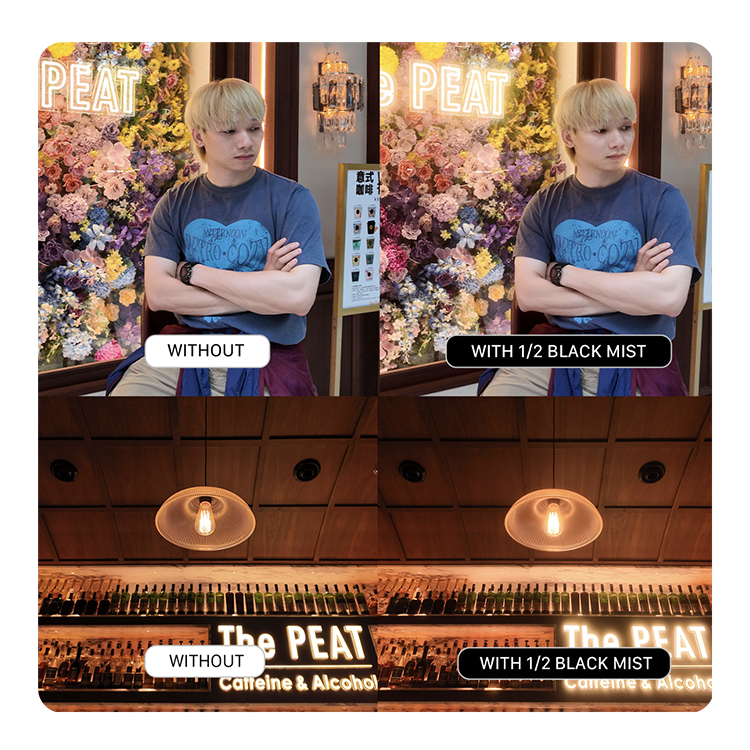 Винтажная мягкостьBlack Mist фильтр создаст аккуратное размытие от источников света, что создаст в кадре магию винтажного кадра. Помимо этого сглаживаются неровности кожи и текстур. Незаменимый инструмент если вы хотите снимать в стиле ретро |