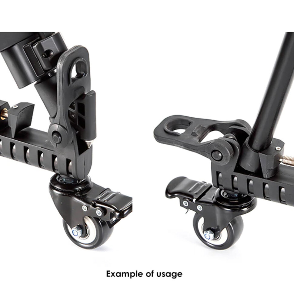 Тележка оснащена мягкими прорезиненными колесами диаметром 50 мм, которые обеспечивают плавное передвижение и устойчивость на разных поверхностях. Каждое колесо оборудовано независимым тормозным механизмом, позволяющим надежно фиксировать положение. Встроенная ручка облегчает переноску, а прочная конструкция делает Miliboo MJL01 отличным выбором для студийной и выездной съемки |