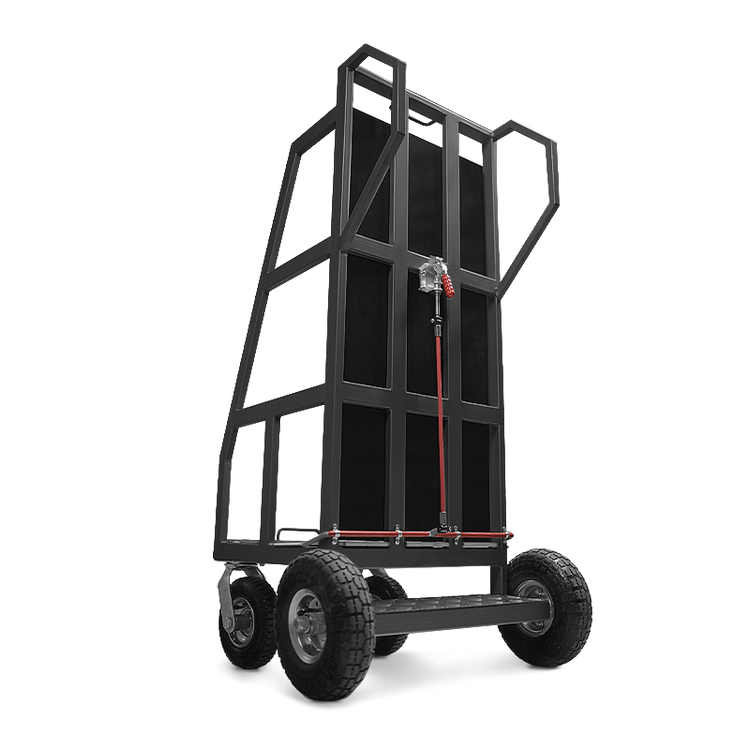 Основные колеса с усиленными подшипниками выдерживают нагрузку до 120 кг каждое, а также оборудованы ручным тормозом. Передние колеса поворотные, для лёгкого перемещения по съёмочной площадке. С задней стороны расположены ручки и ступенька, призванные помочь при движении загруженной тележки |