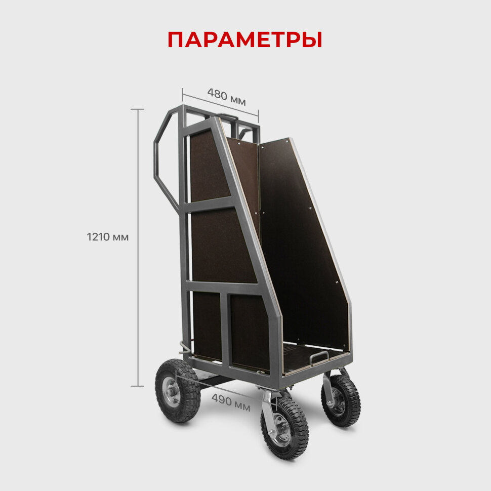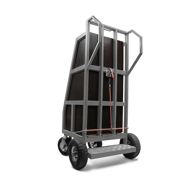 Основные колеса с усиленными подшипниками выдерживают нагрузку до 120 кг каждое, а также оборудованы ручным тормозом. Передние колеса поворотные, для лёгкого перемещения по съёмочной площадке. С задней стороны расположены ручки и ступенька, призванные помочь при движении загруженной тележки |
