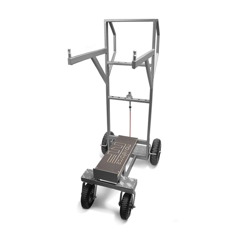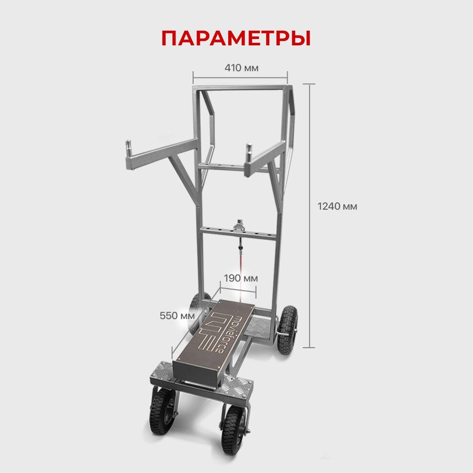 Основные колеса с усиленными подшипниками выдерживают нагрузку до 120 кг каждое, а также оборудованы ручным тормозом. Передние колеса поворотные, для лёгкого перемещения по съёмочной площадке. С задней стороны расположены ручки и ступенька, призванные помочь при движении загруженной тележки |