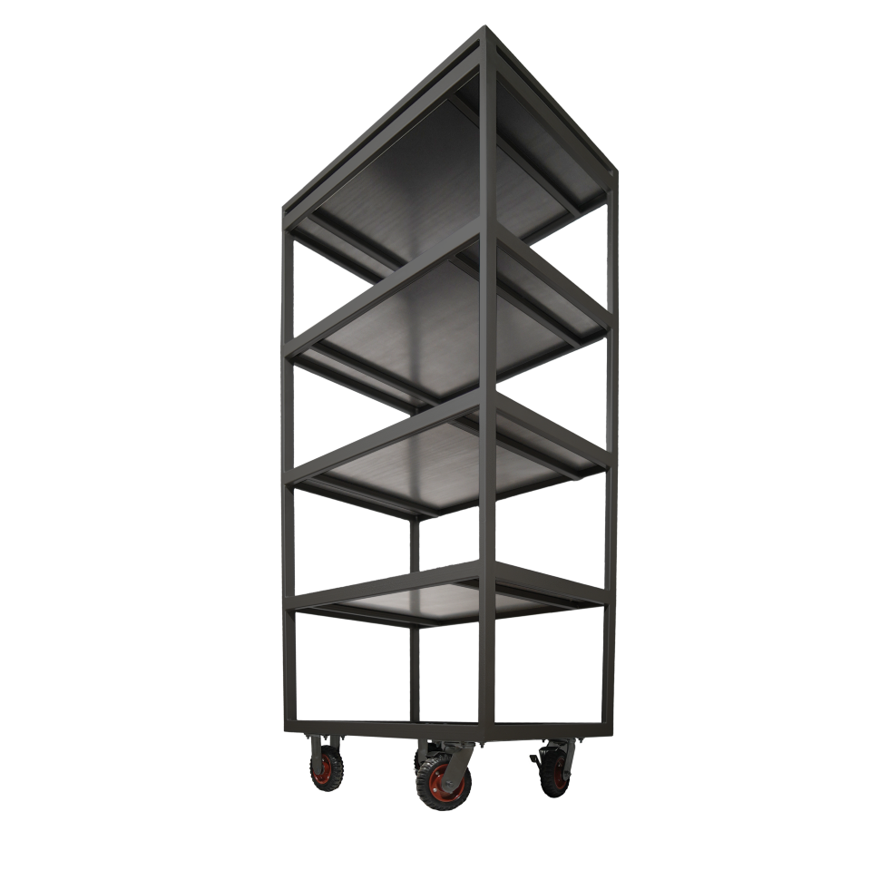 Модель имеет пять полок выполненных из ламинированной фанеры 9мм. Верхняя полка имеет бортик и подходит для долгосрочного хранения раходников и оснащения. Оборудована двумя фикисрованными и двумя поворотными колесами с тормозом, каждое из которых способно выдержать до 240 кг |