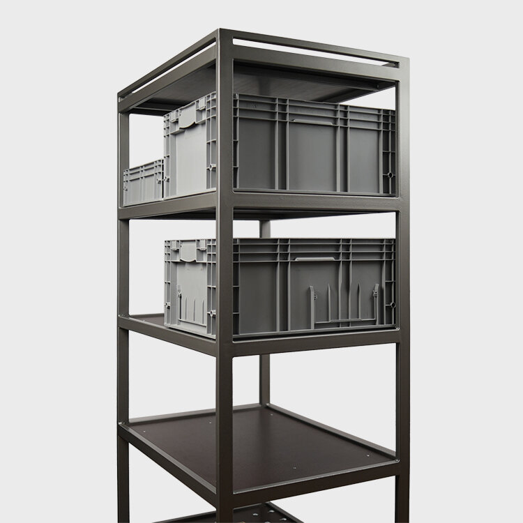 Модель имеет пять полок выполненных из ламинированной фанеры 9мм. Верхняя полка имеет бортик и подходит для долгосрочного хранения раходников и оснащения. Оборудована двумя фикисрованными и двумя поворотными колесами с тормозом, каждое из которых способно выдержать до 240 кг |