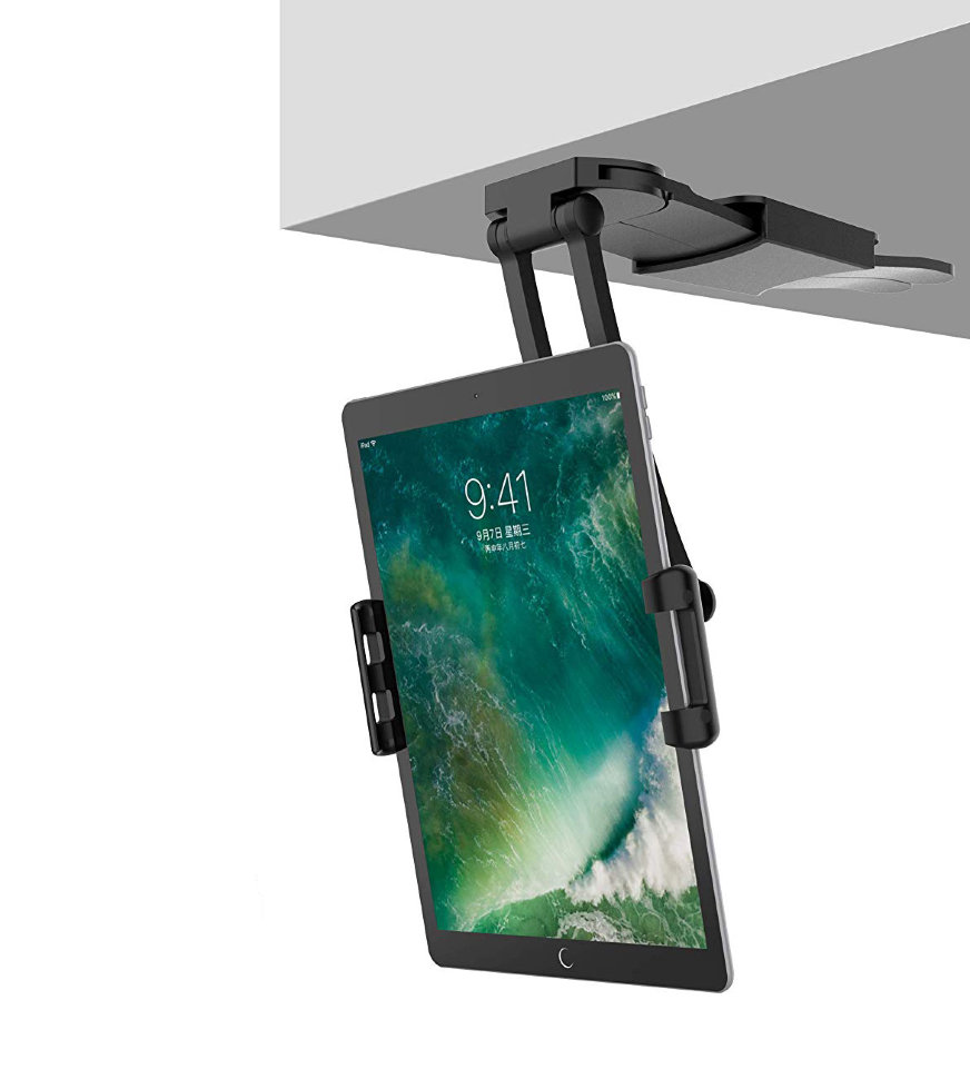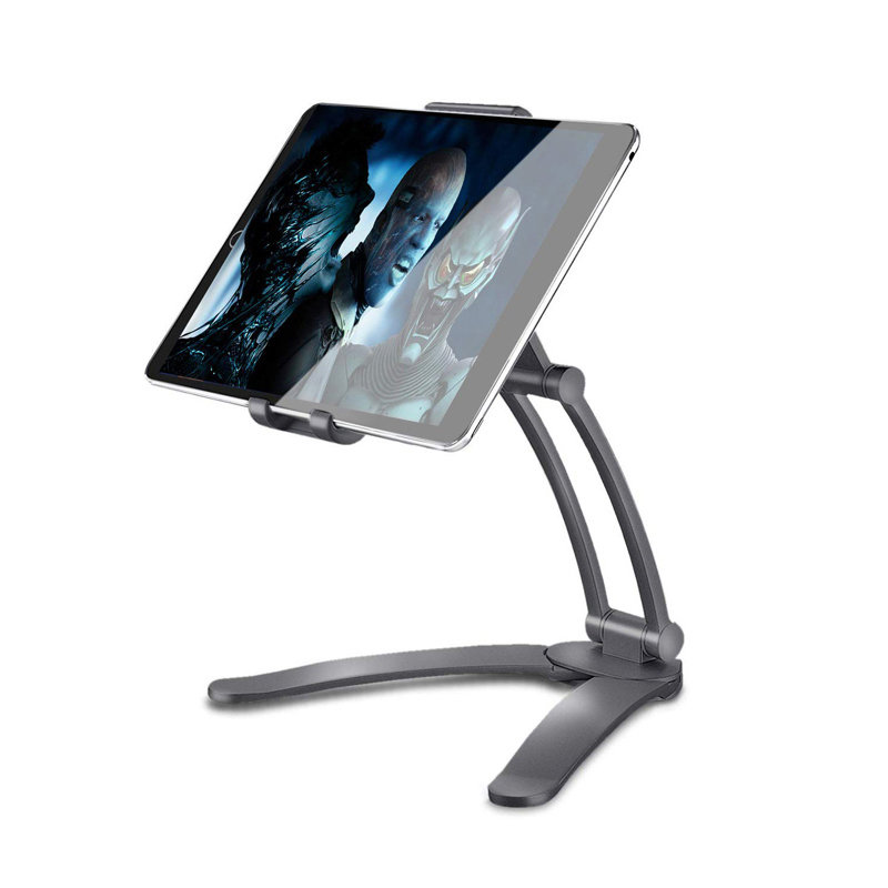 Специальная подставка в комплекте позволяет установить держатель на стену, тем самым освободив место на рабочем столе. Также, эта особенность позволяет выбрать удобную высоту для работы с гаджетом стоя |