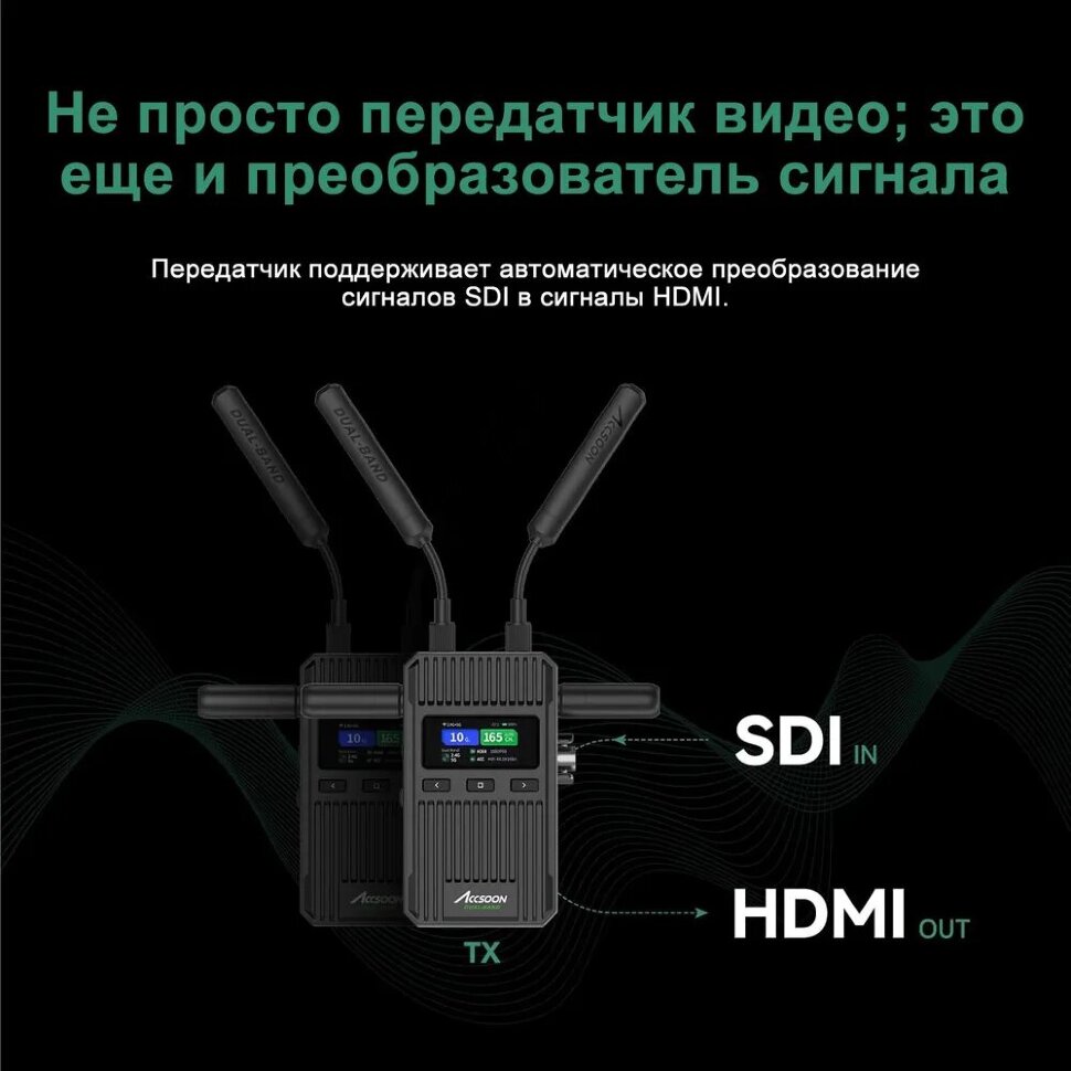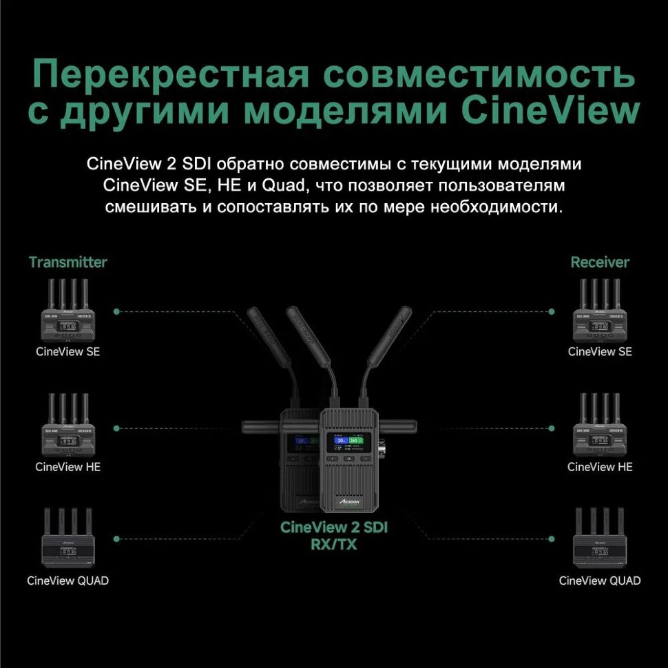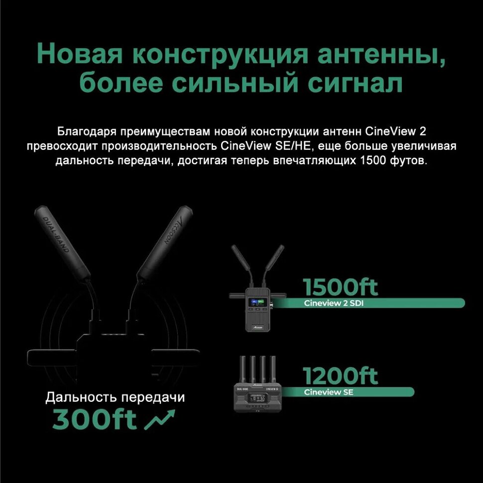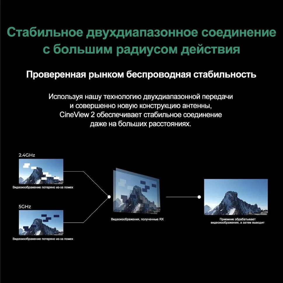 Улучшенная технология Dual-Band 2,4 ГГц + 5 ГГцС новыми антеннами CineView 2 способен передавать видео и аудио в разрешении 1080P с частотой 60 кадров в секунду на расстояние до 450 метров при прямой видимости и с минимальной задержкой, менее 50 мс |