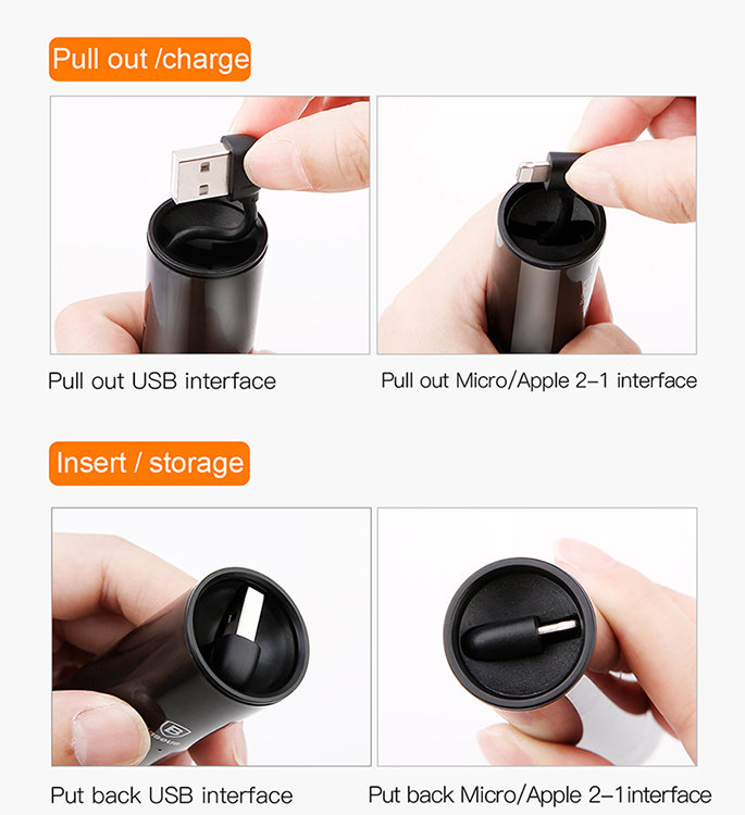 | Встроенный провод с универсальным двухсторонним коннектором позволяет заряжать мобильный устройства от Apple и гаджеты с micro USB |
