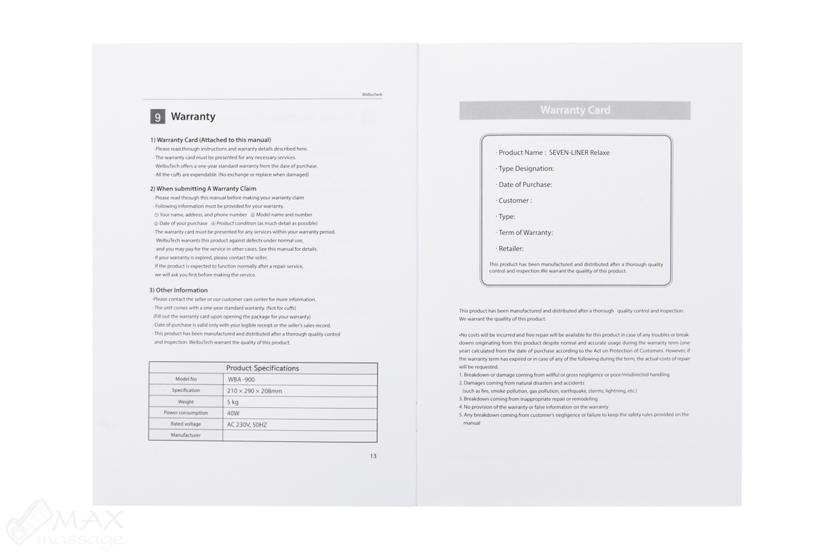 Комплексное оздоровление c WBA-900Seven Liner Relaxe WBA-900 – южнокорейский пневмокомпрессионный аппарат, предназначенный для массажа, лимфодренажа и прессотерапии всего тела. Это самая многофункциональная модель производителя WelbuTech, представленная на российском рынке. Шестикамерные манжеты, пять режимов работы, плавная регулировка давления и множество вспомогательных функций позволяют подстроить процедуру практически под любые потребности и пожелания. Это устройство отлично подойдёт как для домашнего использования всей семьёй, так и для массажных процедур в салонах красоты, массажных кабинетах, клиниках, санаториях и реабилитационных центрах. Массажёр WBA-900 собран из самых надёжных комплектующих на корейской фабрике под контролем сертифицированных специалистов. На аппарат предоставляется 5 лет гарантии с обслуживанием в сервис-центрах в Москве и Санкт-Петербурге. Желаем приятного массажа с WBA-900! |