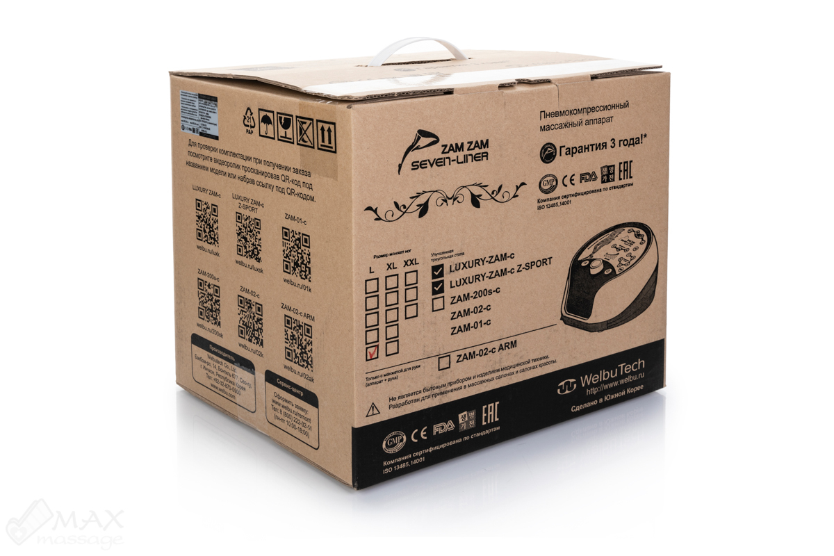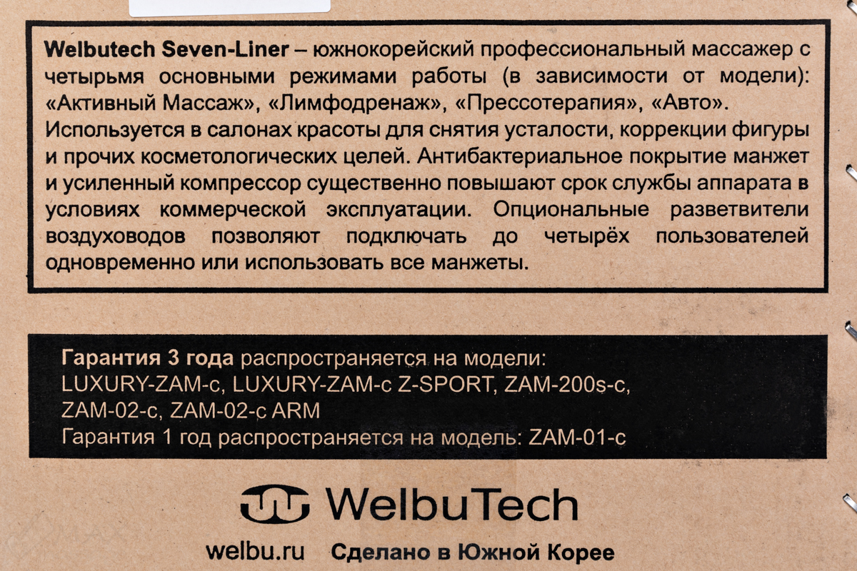 Аппараты для лимфодренажа и прессотерапии производятся в Южной Корее на фабрике WelbuTech, выпускающей качественную массажную технику более 10 лет. Гарантийное и постгарантийное обслуживание выполняется в авторизованном сервисном центре MaxMassage. Прибор обладает сертификацией EAC и может безопасно использоваться дома.