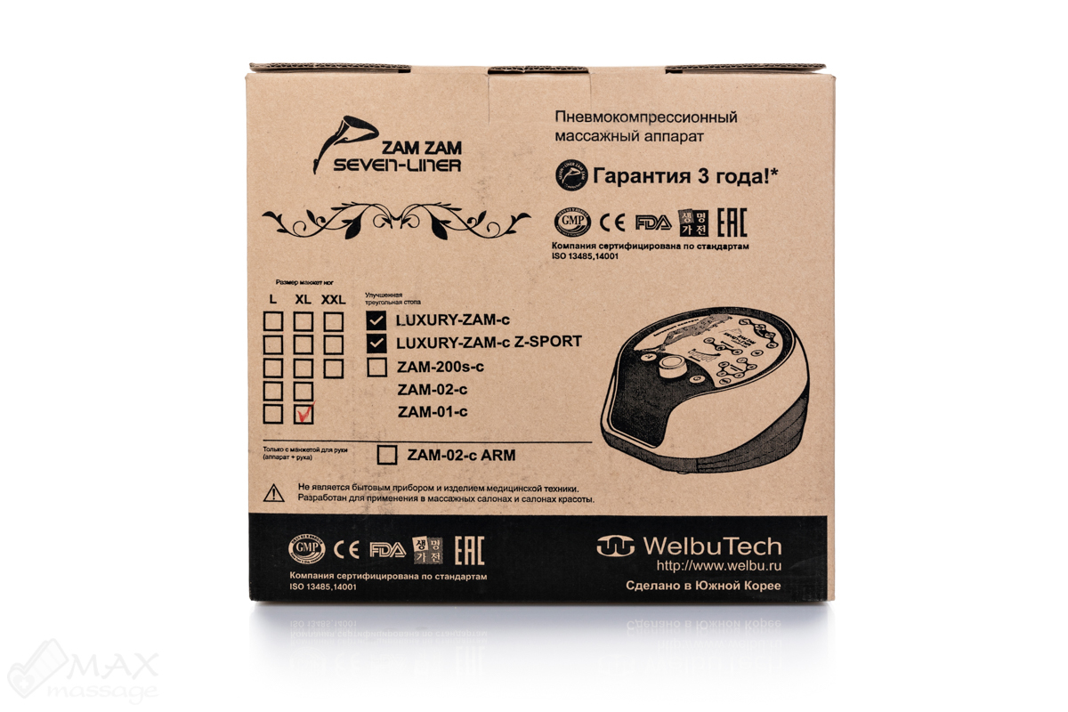 Аппараты для лимфодренажа и прессотерапии производятся в Южной Корее на фабрике WelbuTech, выпускающей качественную массажную технику более 10 лет. Гарантийное и постгарантийное обслуживание выполняется в авторизованном сервисном центре MaxMassage. Прибор обладает сертификацией EAC и может безопасно использоваться дома.