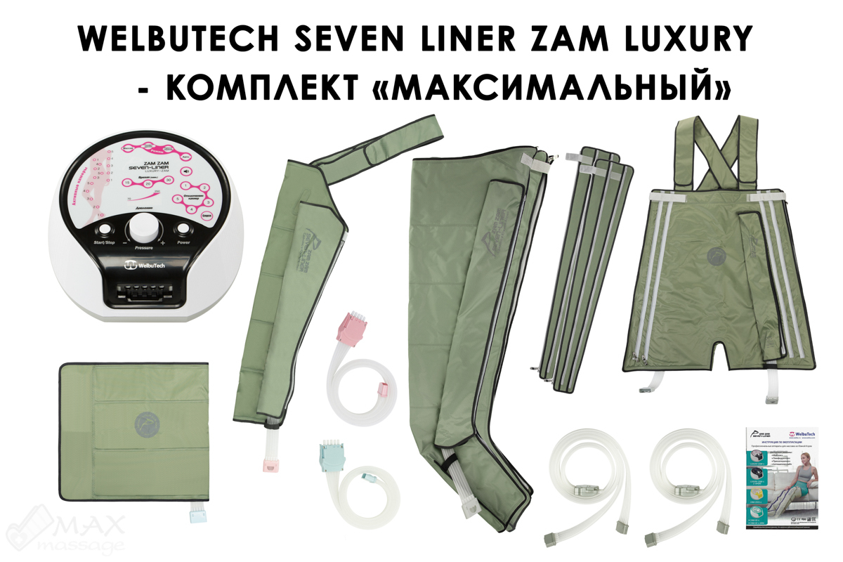 Преимущества и особенности аппарата физиотерапевтического для прессотерапии и лимфодренажа Seven-Liner ZAM ZAM модель LUXURY-ZAM комплект "Максимальный"Для проведения массажных процедур не обязательно тратить время и деньги на посещение специалистов. Если Вы хотите получать качественный массаж не выходя из дома, воспользуйтесь продукцией компании WelbuTech. Среди преимуществ Zam Luxury: