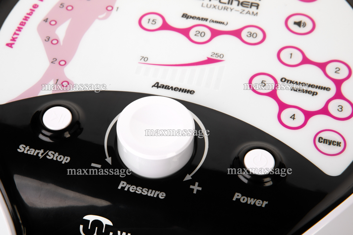 Сенсорная панель управленияНа аппарате слева есть индикатор, который показывает, какую манжету Вы сейчас используете, и в какую камеру подаётся воздух. Сверху находится кнопка выбора режима работы, на правой части – кнопка режима «Без звука» (отключение голосового сопровождения при нажатии кнопок). Это очень удобно, когда у Вас спит маленький ребёнок или Вы просто хотите тишины. Также у Вас есть возможность отключения одной или нескольких камер одновременно. Кроме того, в данном аппарате присутствует кнопка принудительного сдувания всех камер. По центру находится индикатор выбора времени процедуры массажа (15, 20, 30 минут) и шкала уровня давления, которой Вы сами управляете, увеличивая или уменьшая подачу воздуха в камеры, при помощи регулировочного колеса. Внизу справа – кнопка включения аппарата, внизу слева – старт/пауза. Всего несколько нажатий и аппарат готов к работе, полностью под Вашим контролем. |