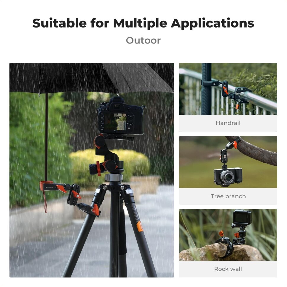 Эргономика и гибкая настройка угловЗажим оснащен удобной ручкой с насечками для быстрого затягивания одной рукой, а двойной шарнир с шаровыми головками позволяет регулировать положение оборудования на 360°. Дополнительный адаптер для экшн-камер открывает возможности для съемки в движении, а разборная конструкция упрощает транспортировку. С этим зажимом вы сможете экспериментировать с ракурсами в любых условиях — от городских улиц до экстремальных локаций |