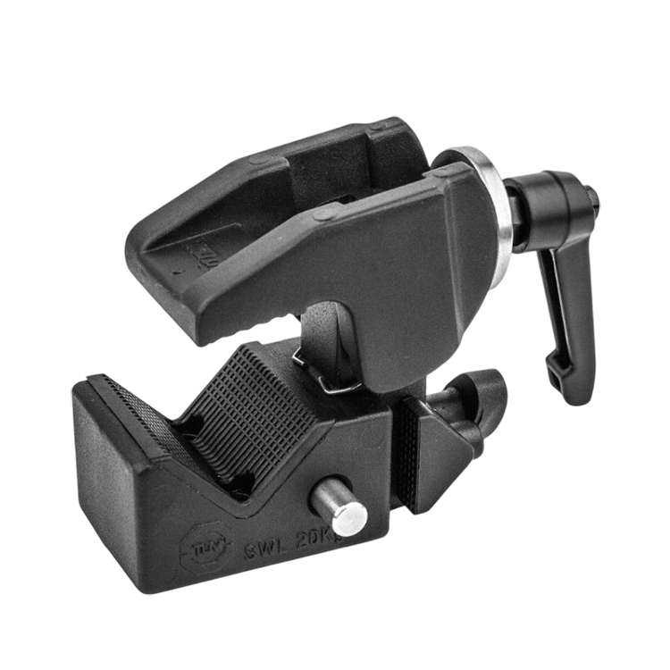 Сертифицированный по стандарту TUV зажим KUPO KCP-710P Super Convi, выполненный из лёгкого алюминиевого сплава, выдерживает нагрузки до 20 кг, становясь основой для модульной системы креплений. Гексагональный ресивер совместим с десятками аксессуаров Convi — от штативов до поворотных рычагов — благодаря пружинной блокировке, которая предотвращает отсоединение даже при ослаблении фиксирующего винта. Зажимная губа регулируется в диапазоне 5–51 мм, а седло с противоскользящим покрытием обеспечивает стабильное крепление на плоских поверхностях. Храповой механизм рукояти позволяет быстро фиксировать объекты в стеснённых условиях, а чёрное износостойкое покрытие дополняет профессиональный дизайн